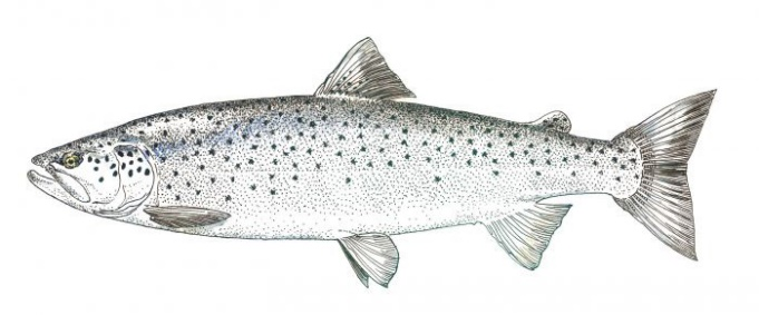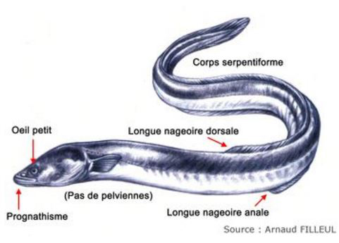 | L’Anguille européenne (Anguilla) est un poisson de forme allongée, au corps cylindrique dans sa partie antérieure et aplati latéralement dans sa région caudale. Sa silhouette rappelle celle du serpent, d’où son nom (du latin anguis, le serpent). Son corps est recouvert de petites écailles et d’un abondant mucus qui la rendent difficile à saisir. Ses longues nageoires dorsale et ventrale qui se rejoignent au niveau de la queue sont insérées en arrière des nageoires pectorales (caractéristique de la famille des Anguillidés). | La truite de mer (Salmon truta) est, comme le saumon, un poisson de la famille des salmonidés, c’est la forme migratrice de la Truite fario et non une espèce différente. |