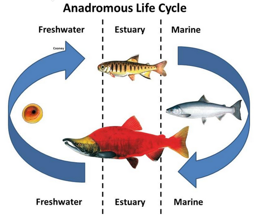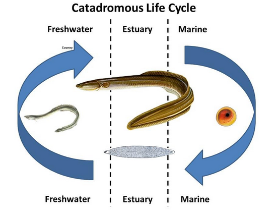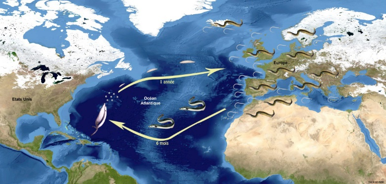 | Espèce catadrome se reproduit en mer | Espèce anadrome se reproduit en eau douce |