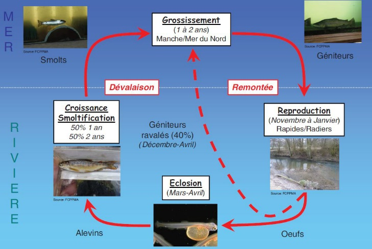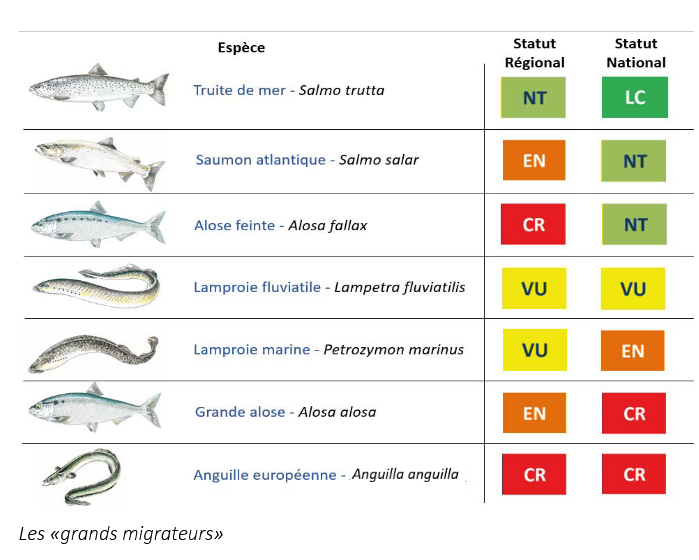 C’est là que naviguent et remontent la truite de mer (Salmo trutta trutta), la lamproie marine (Petromyzon marinus), l’anguille européenne (Anguilla anguilla) et le saumon atlantique (Salmo salar) : des voyageurs au long cours, longtemps bloqués dans leur progression.